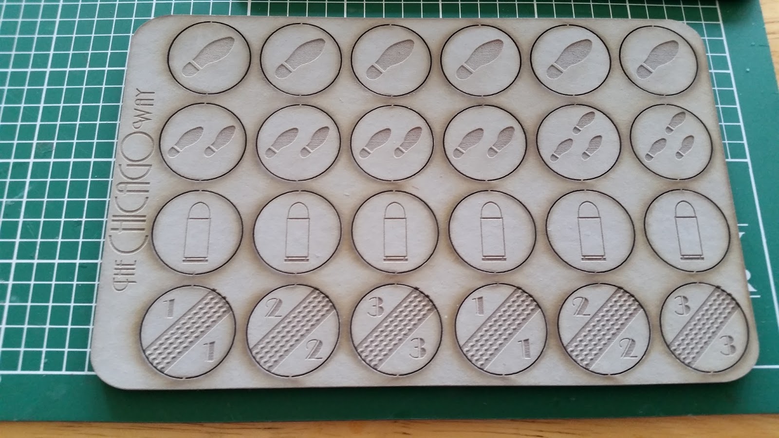 The last thing I picked up was a set of tokens. Again, these are identical to the DMH tokens except for the six vehicle tokens. Not having read the rules yet, my guess is each token represents movement, just like the footsteps do. So a '3' tire mark probably represents 3 moves totaling 18 inches, modifiers would apply just like foot movement when shooting at a vehicle.