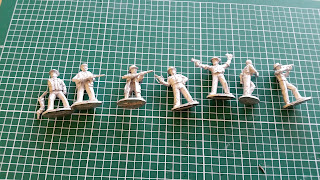 I decide to prep the figures before getting into the rule book - I have a maintenance appointment for my car scheduled tomorrow morning so I figured I'd use that time while waiting to go through the rules and probably write up another post on my thoughts on them. You get seven figures in each box, with each figure modeled with different weapons. Let me just say very quickly that I had a box of Blue Moon's Gangland figures, box one, the named gangsters, that totally went Keyser Soze on me - poof, gone. It was there sitting on the floor next to the painting desk when I was finishing up my Bolt Action Germans a few weeks ago. I had set it there because I knew I wanted to get a jump ahead on TCW with these figures, and then they just completely vanished into thin air. Madness! Anyway...